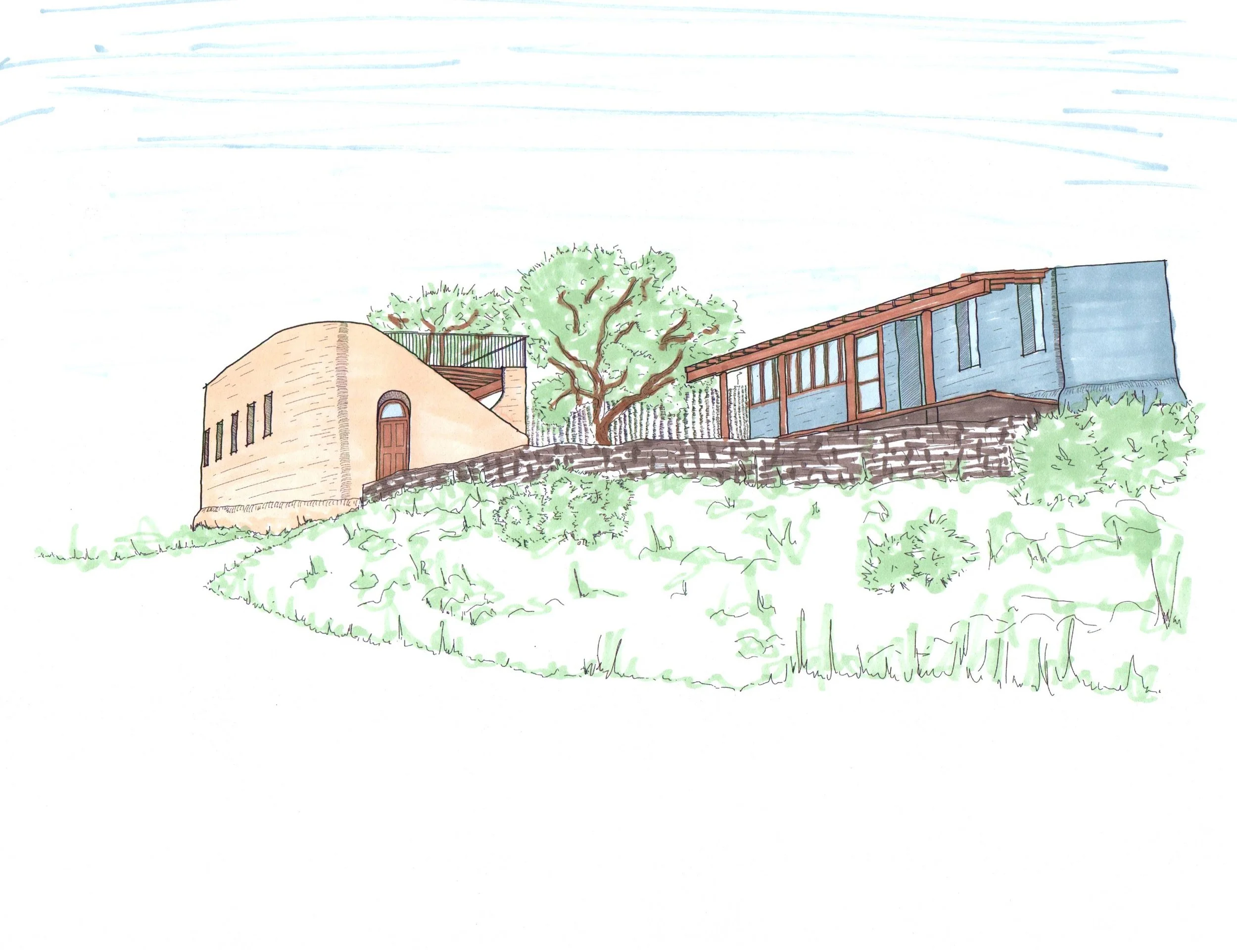This a small adobe home and art studio in the conceptual design phase. Designed to be off-grid, net-0, and self sufficient and to maximize the use of natural materials.